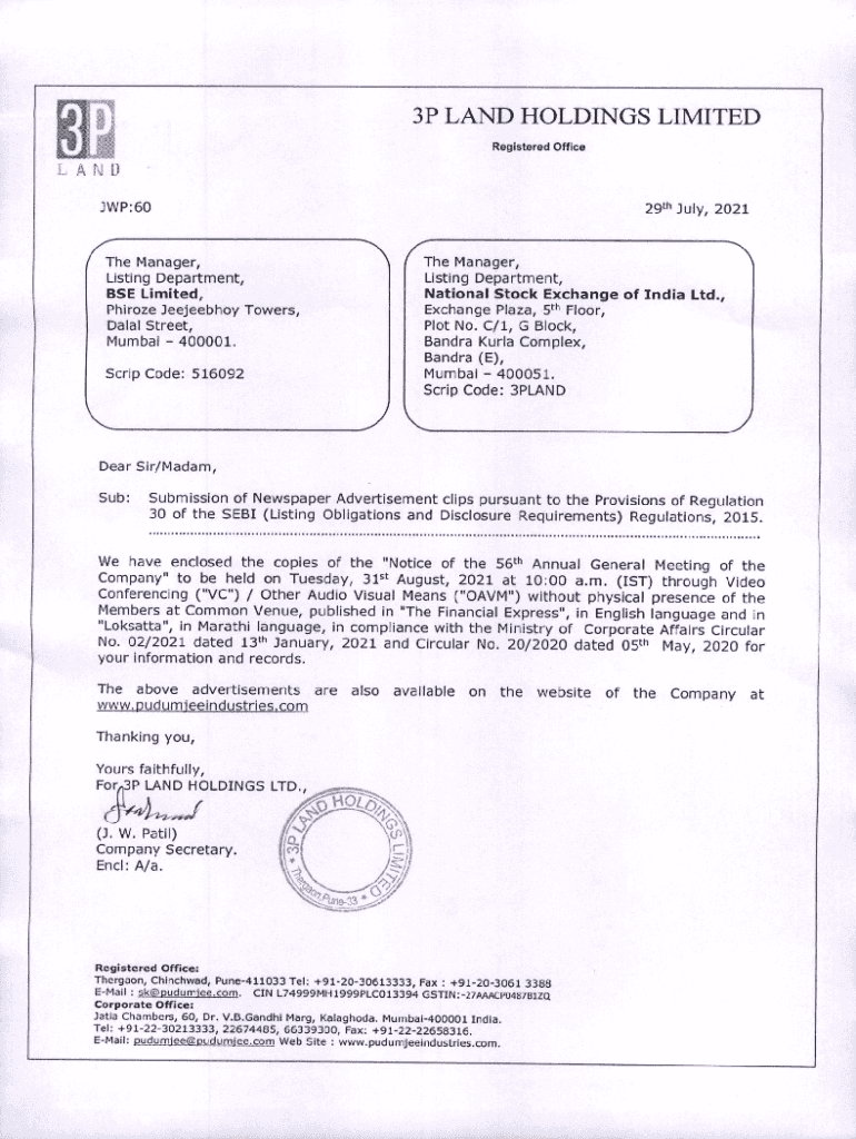 3P LAND HOLDINGS LIMITED Registered Iceland JP:60The Manager, Listing Department, BSE Limited, Phone Jeejeebhoy Towers, Dalai Street, Mumbai 400001. Scrip Code: 51609229th July, 2021The Manager, Listing