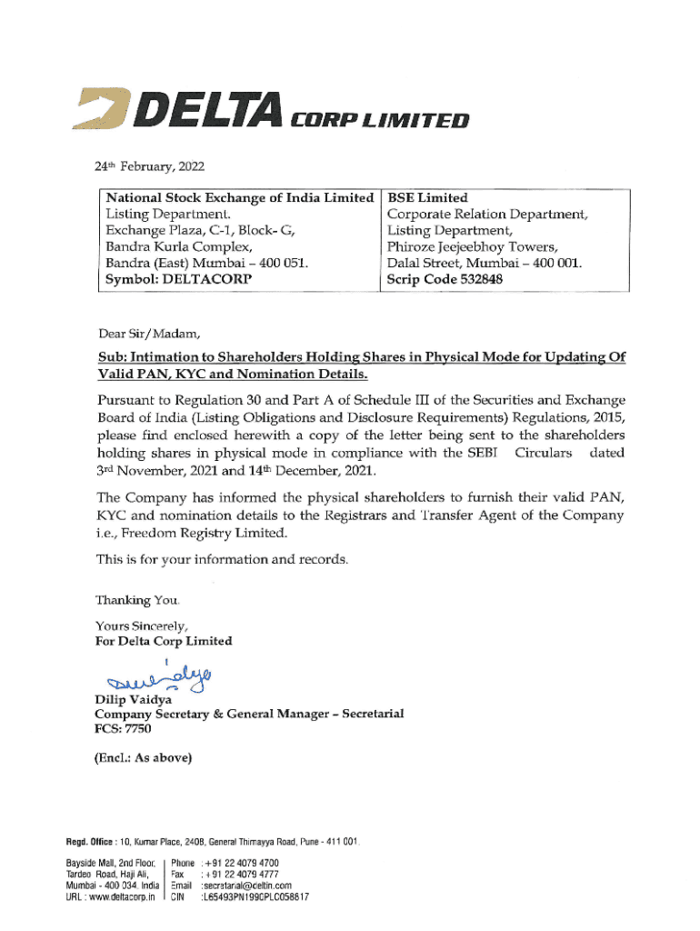 DELTA DELIMITED 24ili February,2022National Stock Exchange of India Limited Listing Department. Exchange Plaza, C1, Block G, Sandra Karla Complex, Sandra (East) Mumbai 400 051. Symbol: DELTACORPBSE
