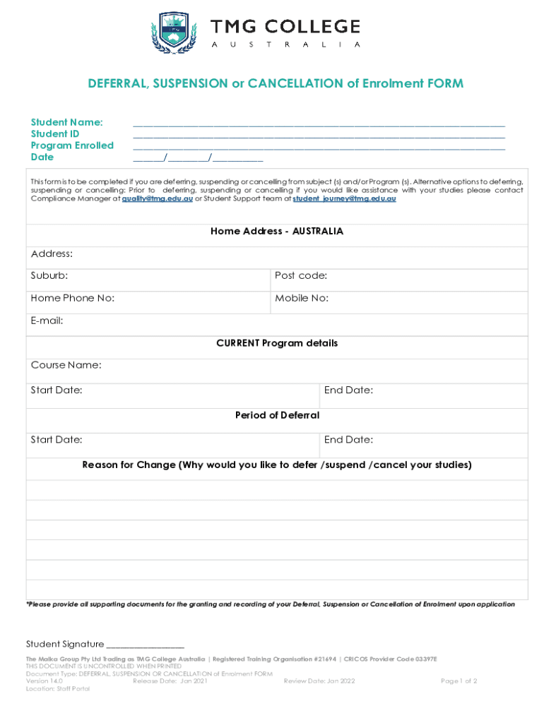Get the free Deferment, Suspension and Cancellation of Enrolment Form