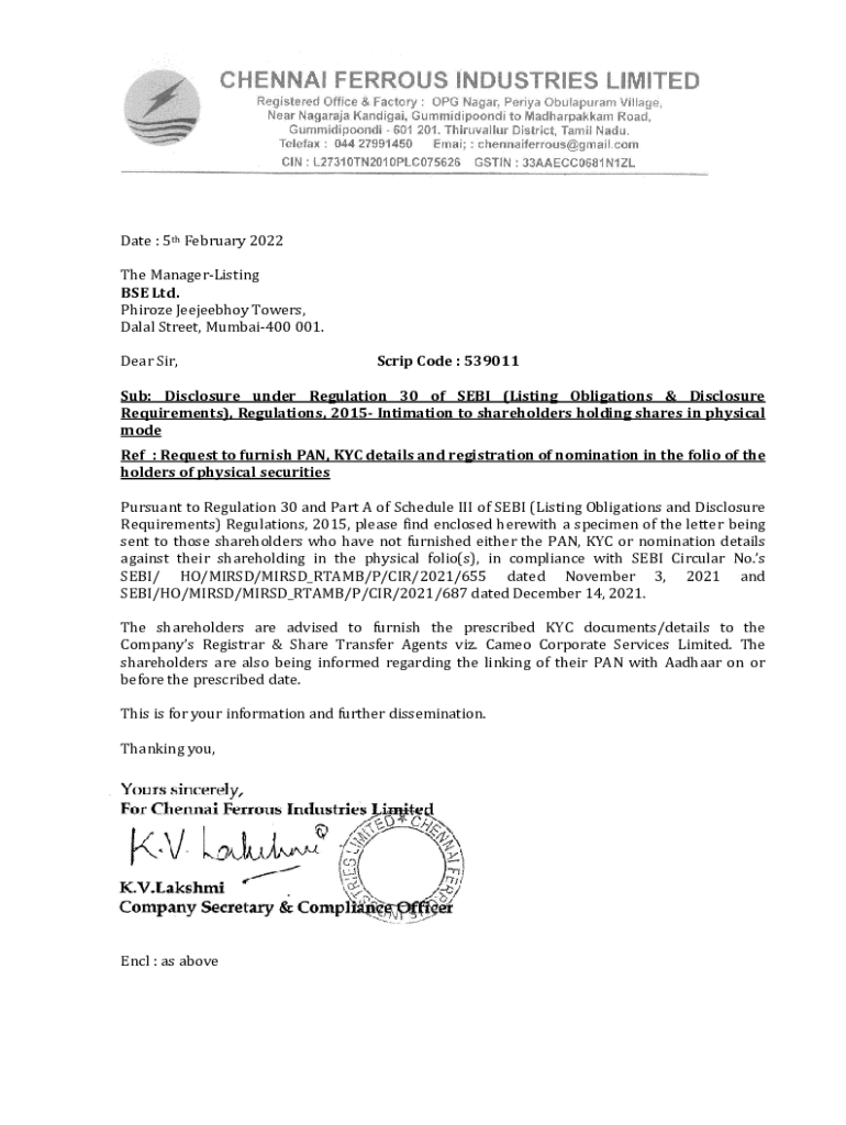 Get the free Intimation to shareholders holding shares in physical mode