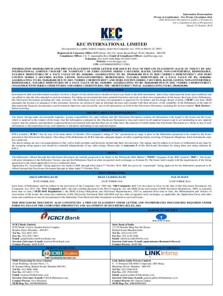 Information Memorandum Private & Confidential For Private Circulation Only (This Disclosure Document is neither a Prospectus nor a statement in lieu of Prospectus) Dated: 27 October 2016KEC INTERNATIONAL