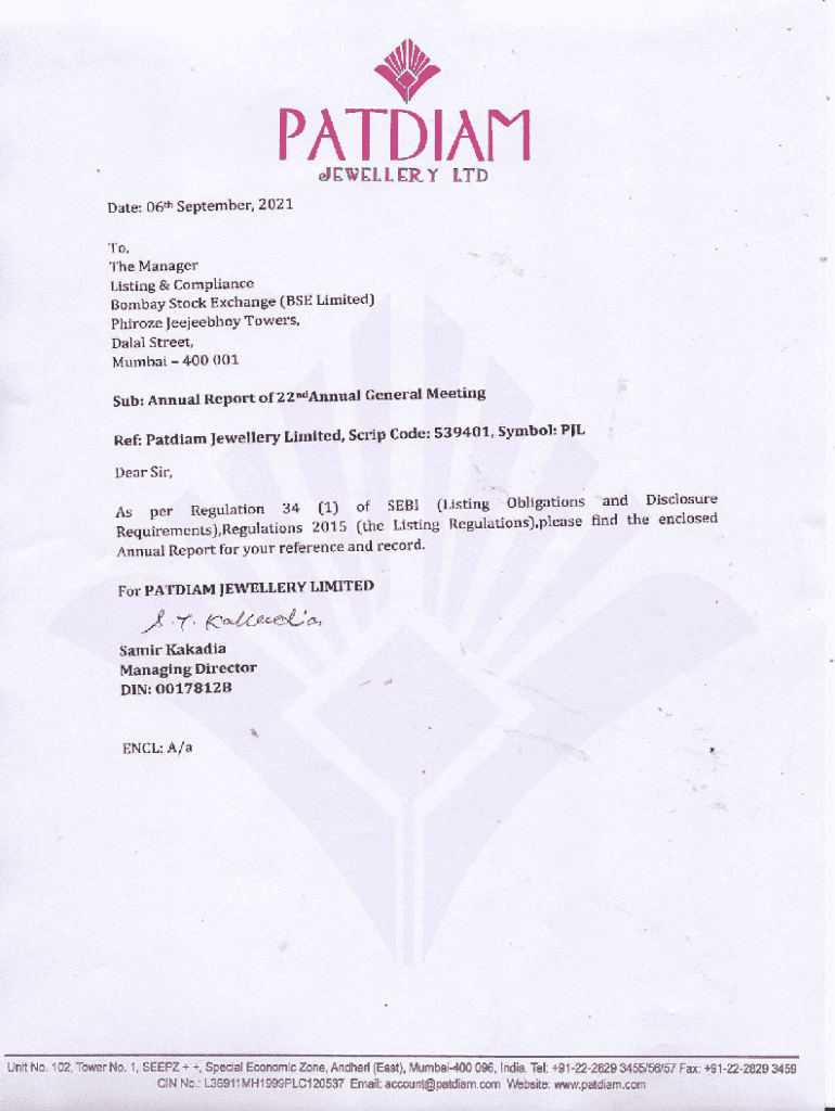 22ND ANNUAL REPORT 202021PATDIAM Jewelry LIMITED IN: L36911MH1999PLC120537 Red. Office: Gala No 102, Bldg No. 1, SEEP SEZ, Adhere (E) Mumbai (MH) 400 096 Tells: +222829 3455/56; Fax: +222829 3459