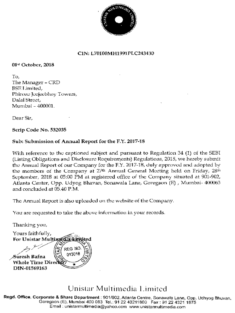 IN: L70100MH1991PLC243430 01StOctober, 2018To, TheManagerCRDBSE Limited, PhirozeJeejeebhoy Towers, Daley Street, Mumbai 400001. Dear Sir, Scripted No. 532035Sub: Submission of AnnualReport for the.