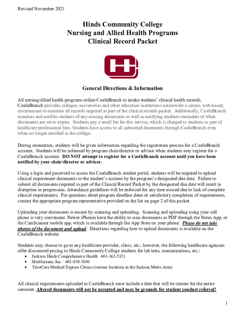Revised November 2021Hinds Community College Nursing and Allied Health Programs Clinical Record PacketGeneral Directions & Information All nursing/allied health programs utilize Castle Branch to intake