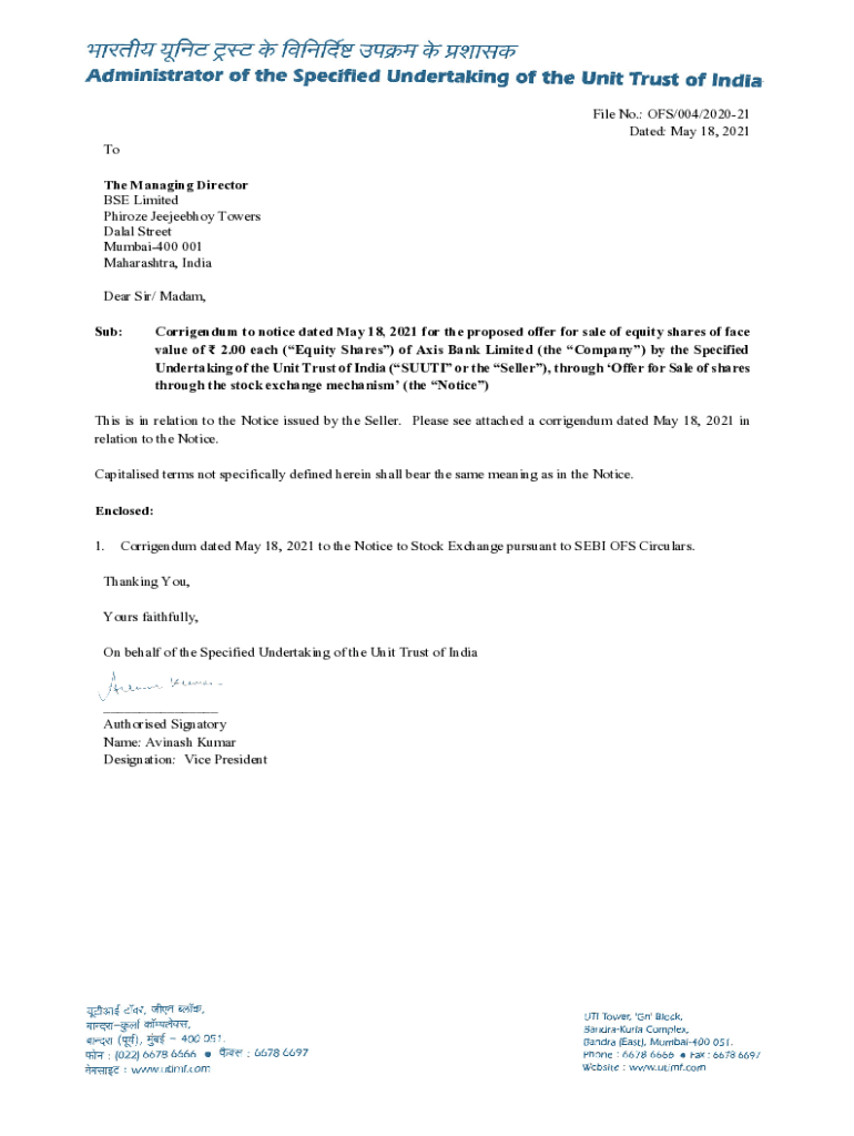 File No.: OFS/004/202021 Dated: May 18, 2021, To The Managing Director BSE Limited Phone Jeejeebhoy Towers Daley Street Mumbai400 001 Maharashtra, India Dear Sir/ Madam, Sub:Corrigendum to notice