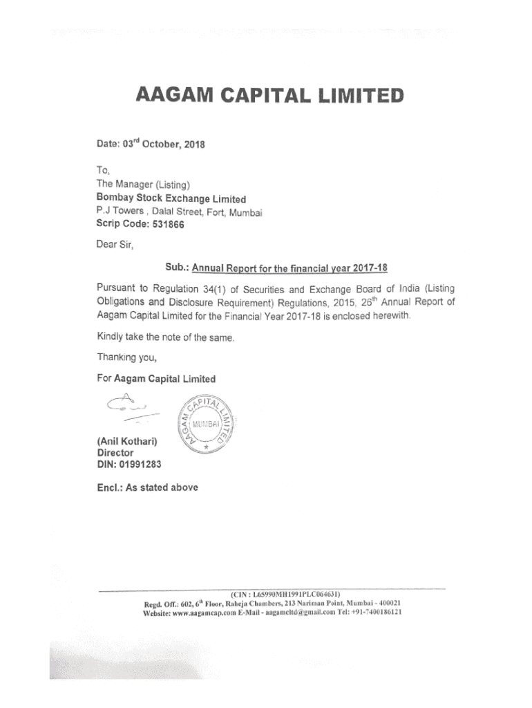 AA GAM CAPITAL LIMITED Date:03\” 1 October, 2018To, Manager (Listing) Bombay Stock Exchange P. J TowersScrip, DalalLimitedStreet, Fort, Municode: 531866Dear Sir, Sub.: Annual Report for the financial