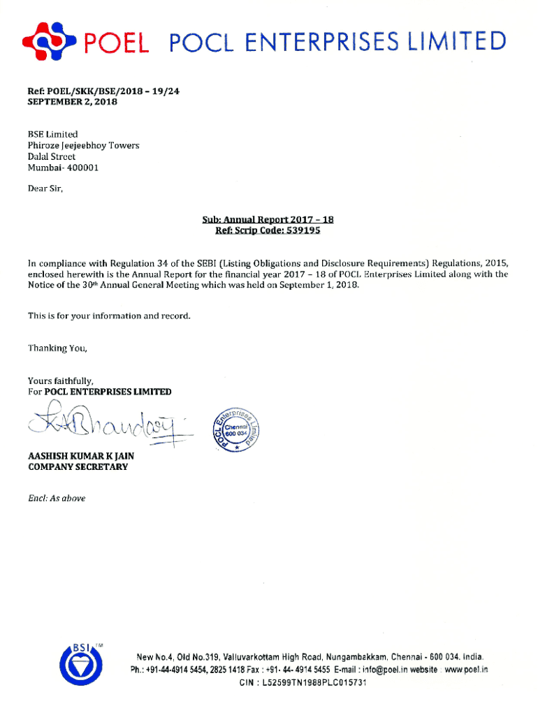 POLLOCK ENTERPRISES Limited: POEM/SKK/BSE/2018 19/24 SEPTEMBER 2.2018BSE Limited Phone Jeejeebhoy Towers Daley Street Mumbai 400001 Dear Sir, Sub: Annual Report 2017 18 Refs: Scrip Code: 539195In