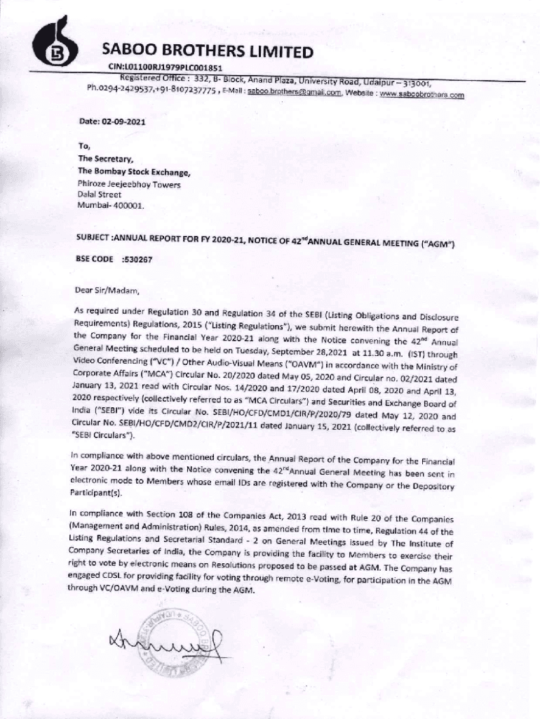 BAMBOO BROTHERS LIMITED:LO1100RJ1979PLC001851 Registered Office : 332, B Block, Anand Plaza, University Road, Udaipur 313007, pH.02942429537,+918107237775, Email : taboo. Brother s@gmail.com, Website