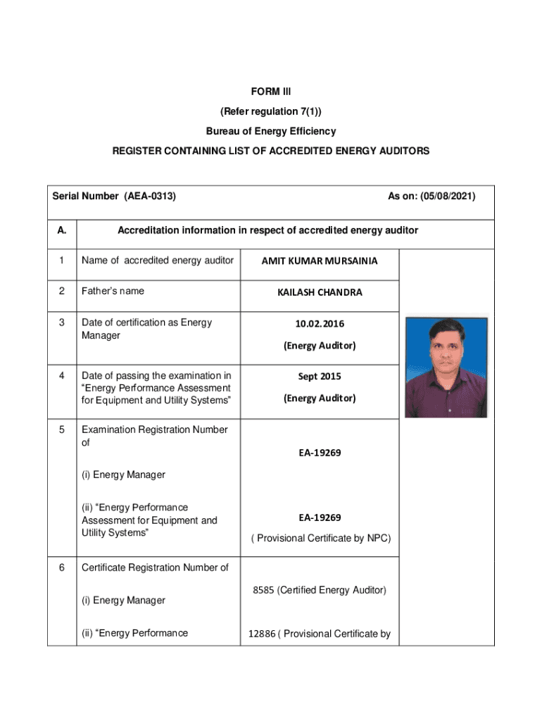 FORM III (Refer regulation 7(1)) Bureau of Energy Efficiency REGISTER CONTAINING LIST OF ACCREDITED ENERGY AUDITORSSerial Number (AEA0313) A. Accreditation information in respect of accredited energy