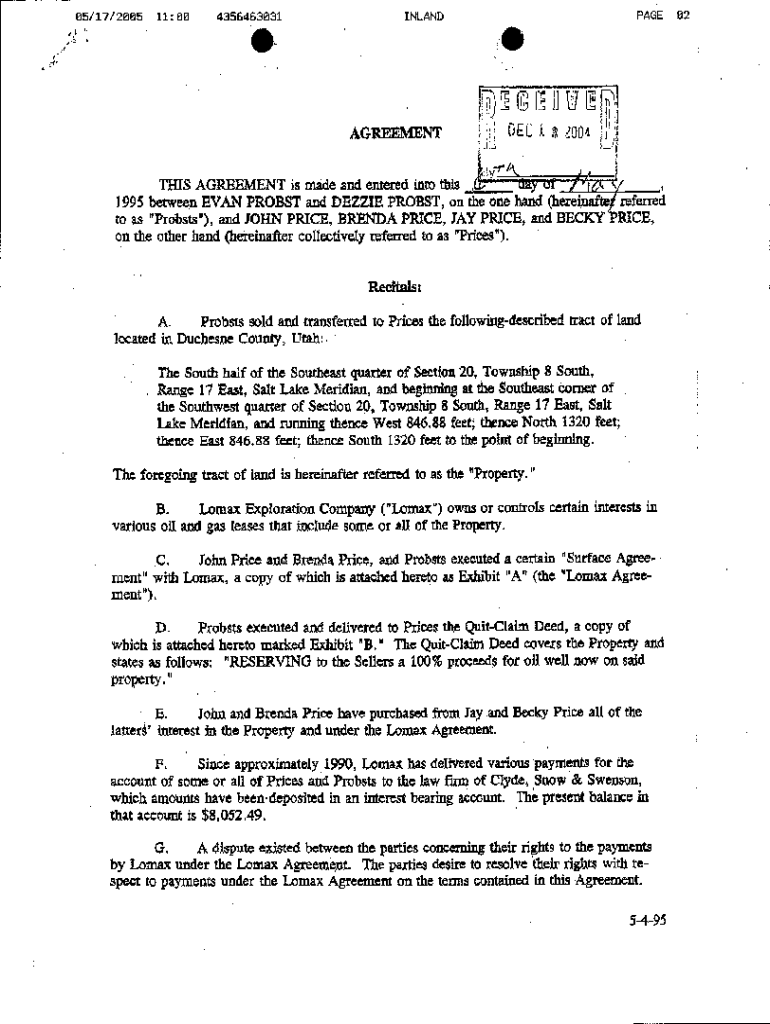05/17/200511:004356463031PAGE 02INLANDDEC 8 2004AGREEMENT.1aay of / t AF THIS AGREEMENT is made and entered into this, 1995 between EVAN PROUST and DEBBIE PROUST, on the one hand (hereinafter referred