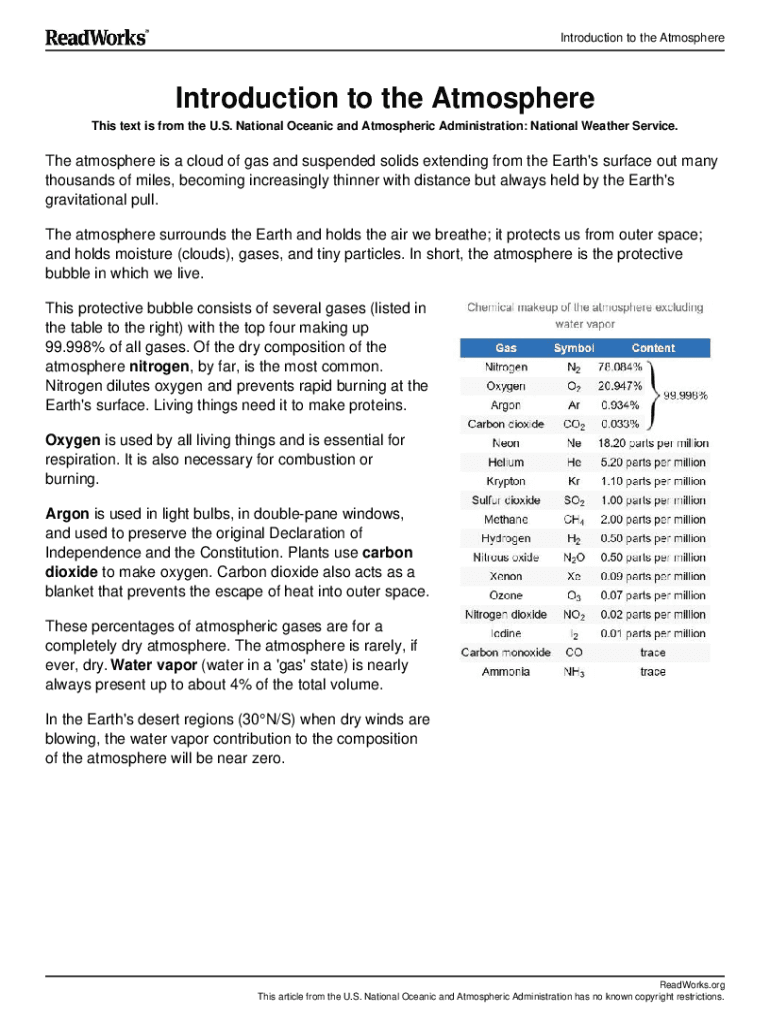 Introduction to the AtmosphereIntroduction to the Atmosphere This text is from the U.S. National Oceanic and Atmospheric Administration: National Weather Service. The atmosphere is a cloud of gas
