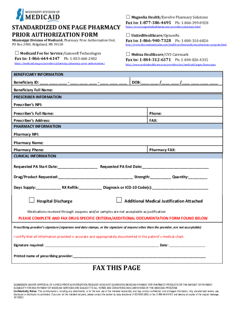 Magnolia Health/Involve Pharmacy SolutionsSTANDARDIZED ONE-PAGE PHARMACY PRIOR AUTHORIZATION FORM Mississippi Division of Medicaid, Pharmacy Prior Authorization Unit, PO Box 2480, Ridgeland, MS 39158