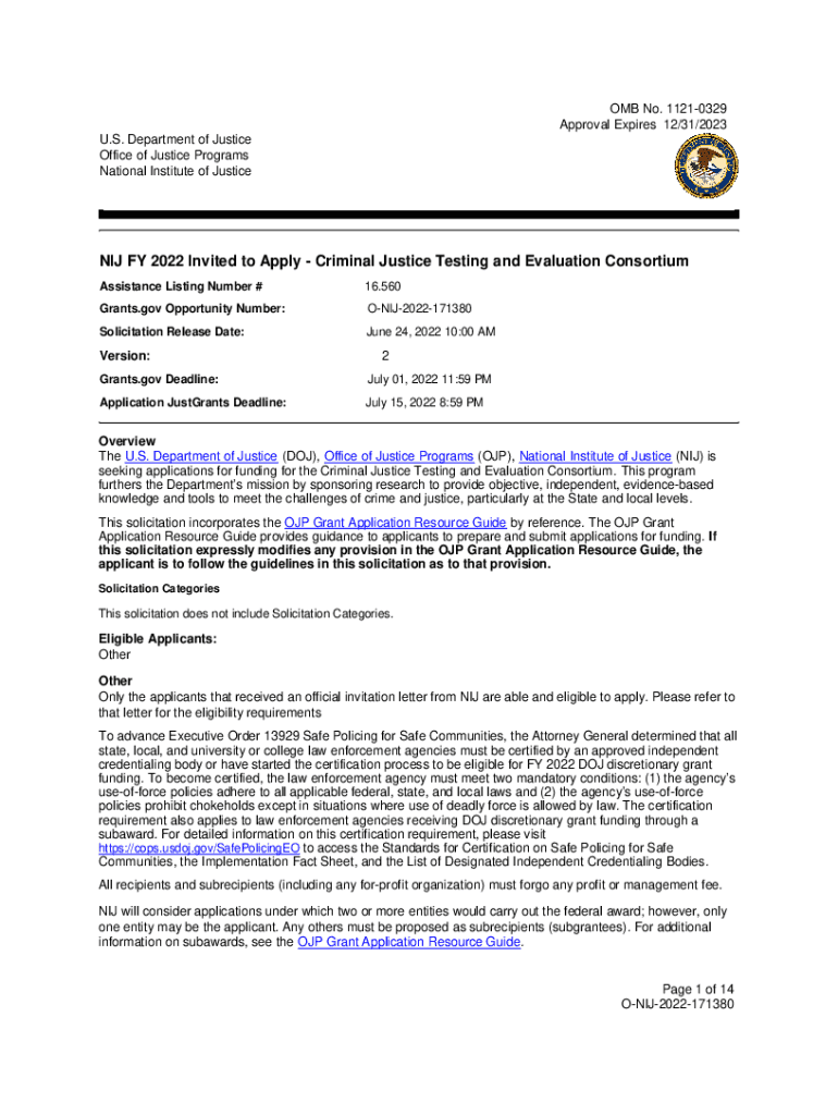 OMB No.11210329 Approval Expires 12/31/2023 U.S. Department of Justice Office of Justice Programs National Institute of Justice FY 2022 Invited to Apply Criminal Justice Testing and Evaluation Consortium