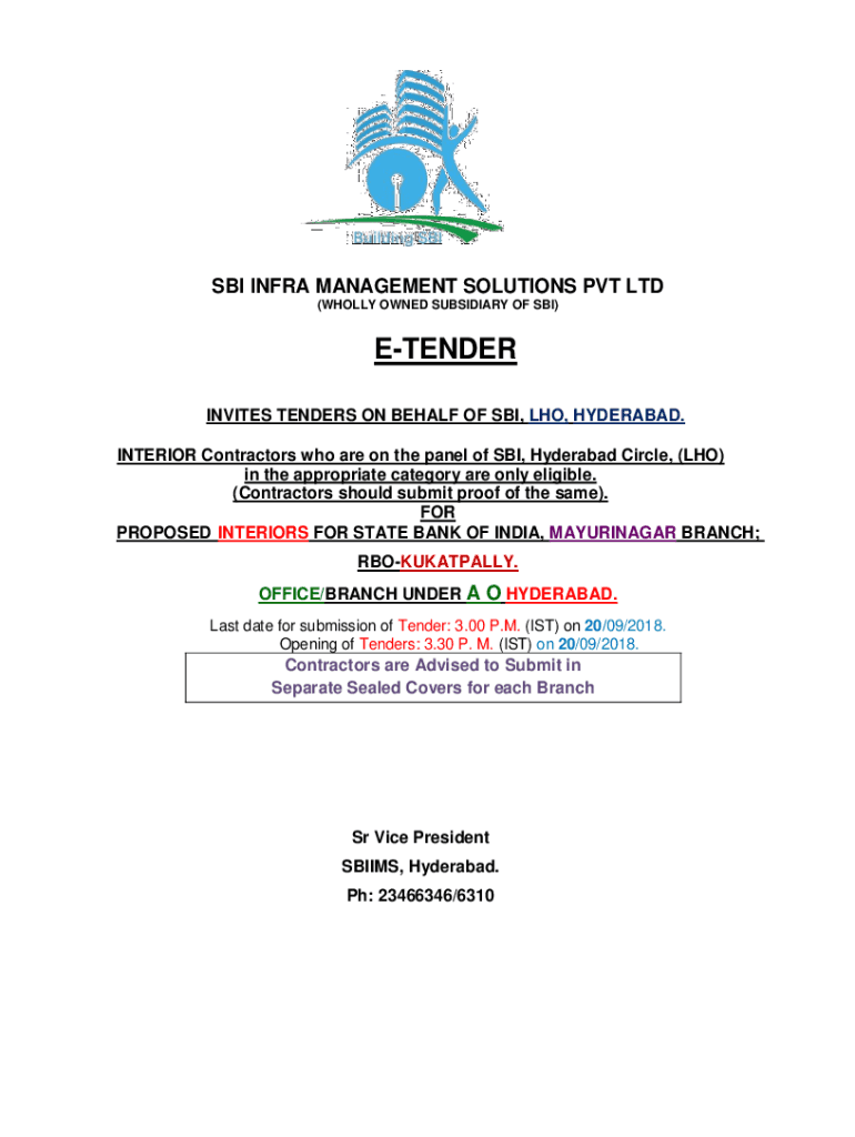 SBI INFRA MANAGEMENT SOLUTIONS PVT LTD (WHOLLY OWNED SUBSIDIARY OF SBI)TENDER INVITES TENDERS ON BEHALF OF SBI, WHO, HYDERABAD. INTERIOR Contractors who are on the panel of SBI, Hyderabad Circle,