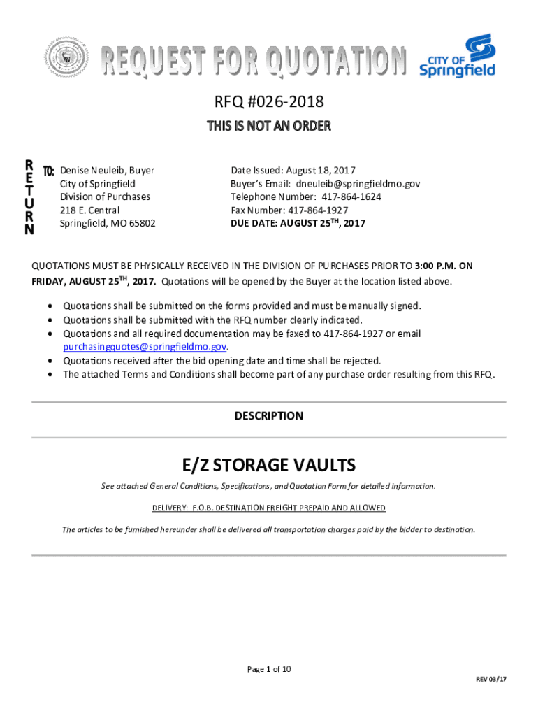 RFQ #0262018Denise Neural, Buyer City of Springfield Division of Purchases 218 E. Central Springfield, MO 65802Date Issued: August 18, 2017, Buyers Email: dneuleib@springfieldmo.gov Telephone Number: