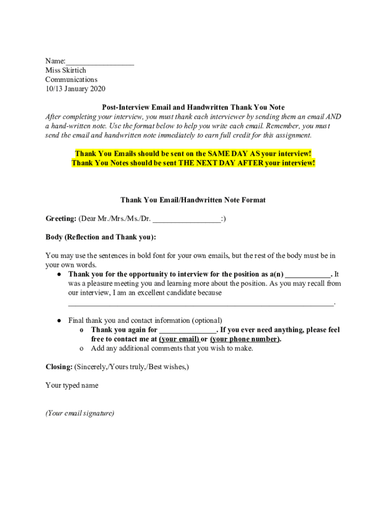 Name:___ Miss Skirmish Communications 10/13 January 2020 PostInterview Email and Handwritten Thank You Note After completing your interview, you must thank each interviewer by emailing them AND a