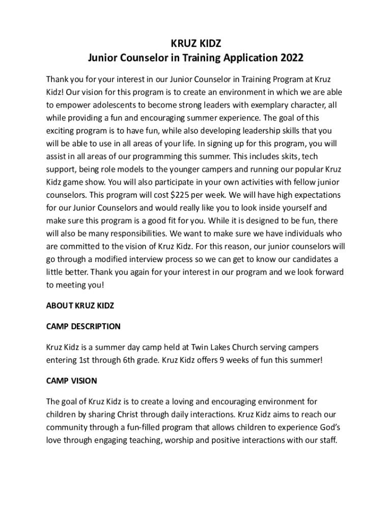 CRUZ KIDS Junior Counselor in Training Application 2022 Thank you for your interest in our Junior Counselor in Training Program at Cruz Kids! Our vision for this program is to create an environment