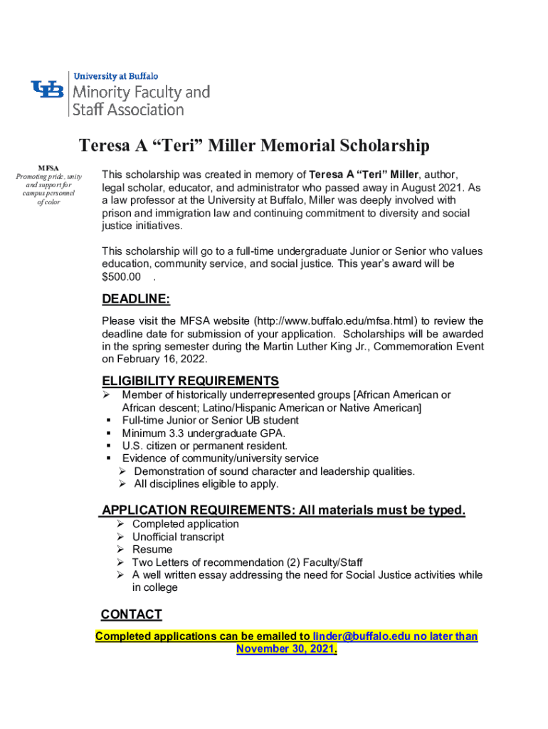 Teresa A Teri Miller Memorial Scholarship MFA Promoting pride, unity and support for campus personnel of clothes scholarship was created in memory of Teresa A Teri Miller, author, legal scholar, educator,