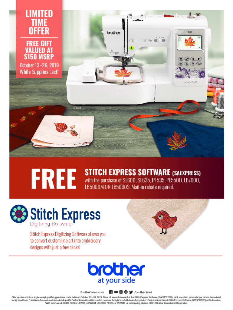 LIMITED TIME OFFEREE GIFT VALUED AT $150 mid-October 13 26, 2019While Supplies Last!SE600FREESTITCH EXPRESS SOFTWARE (EXPRESS) with the purchase of SE600, SE625, PE535, PE550D, LB7000, LB5000M OR