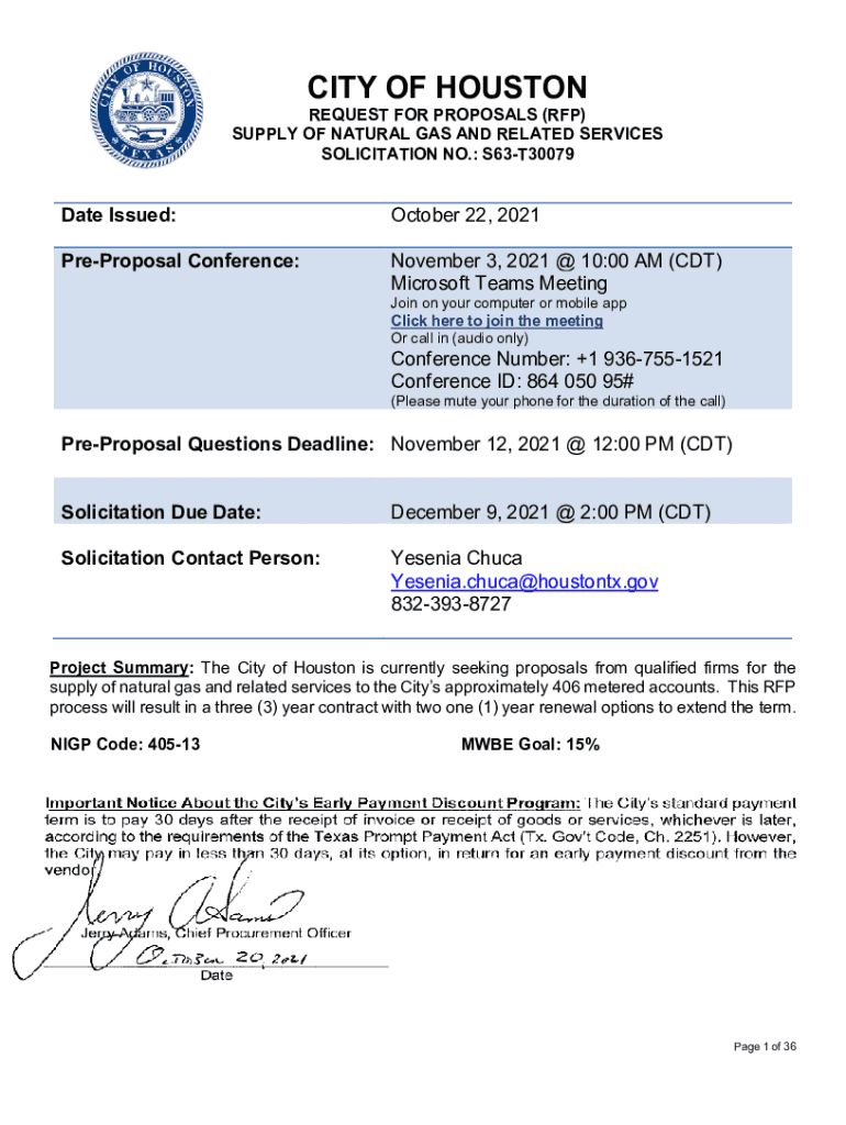 CITY OF HOUSTONREQUEST FOR PROPOSALS (RFP) SUPPLY OF NATURAL GAS AND RELATED SERVICES SOLICITATION NO.: S63T30079Date Issued:October 22, 2021PreProposal Conference:November 3, 2021 @ 10:00 AM (CDT)
