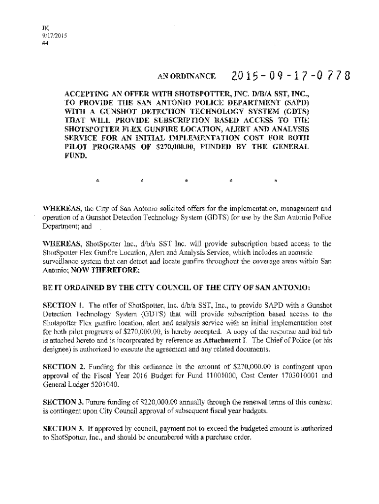 JK 9117/2015 #4AN ORDINANCE20 15 0 9 1 7 0 778ACCEPTING AN OFFER WITH SHOTSPOTTER, INC. D/B/A SST, INC., TO PROVIDE THE SAN ANTONIO POLICE DEPARTMENT (SAID) WITH A GUNSHOT DETECTION TECHNOLOGY SYSTEM