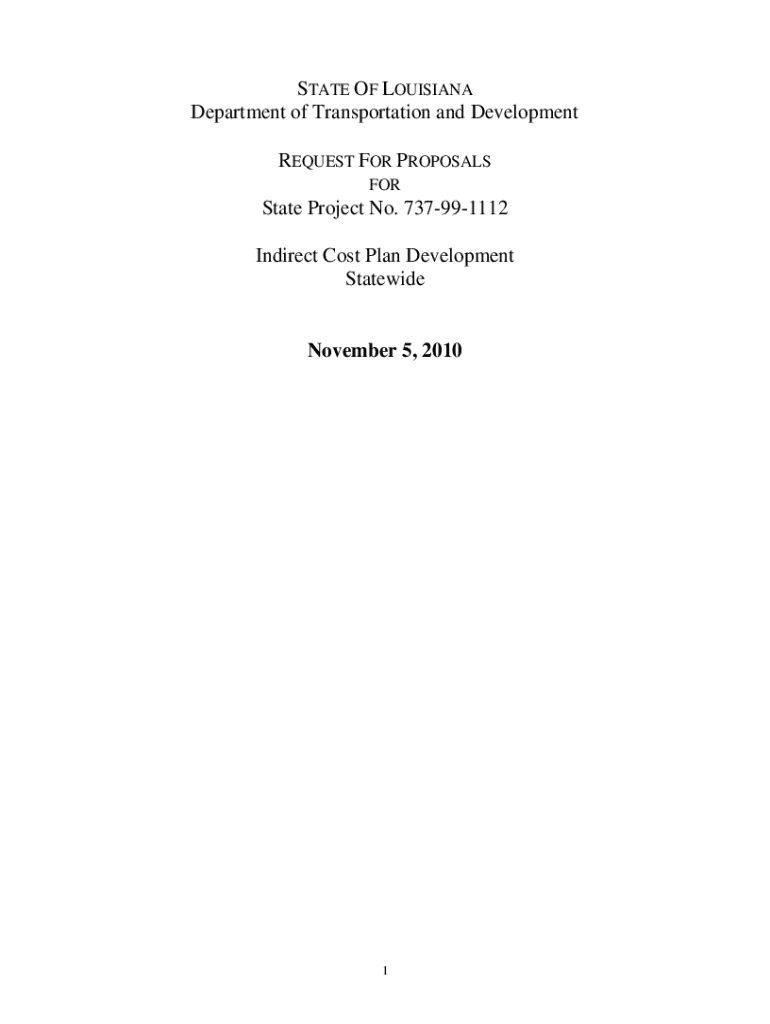 STATE OF LOUISIANA Department of Transportation and Development REQUEST FOR PROPOSALS Forsake Project No. 737991112 Indirect Cost Plan Development Statewide November 5, 20101TABLE OF CONTENTS SECTION
