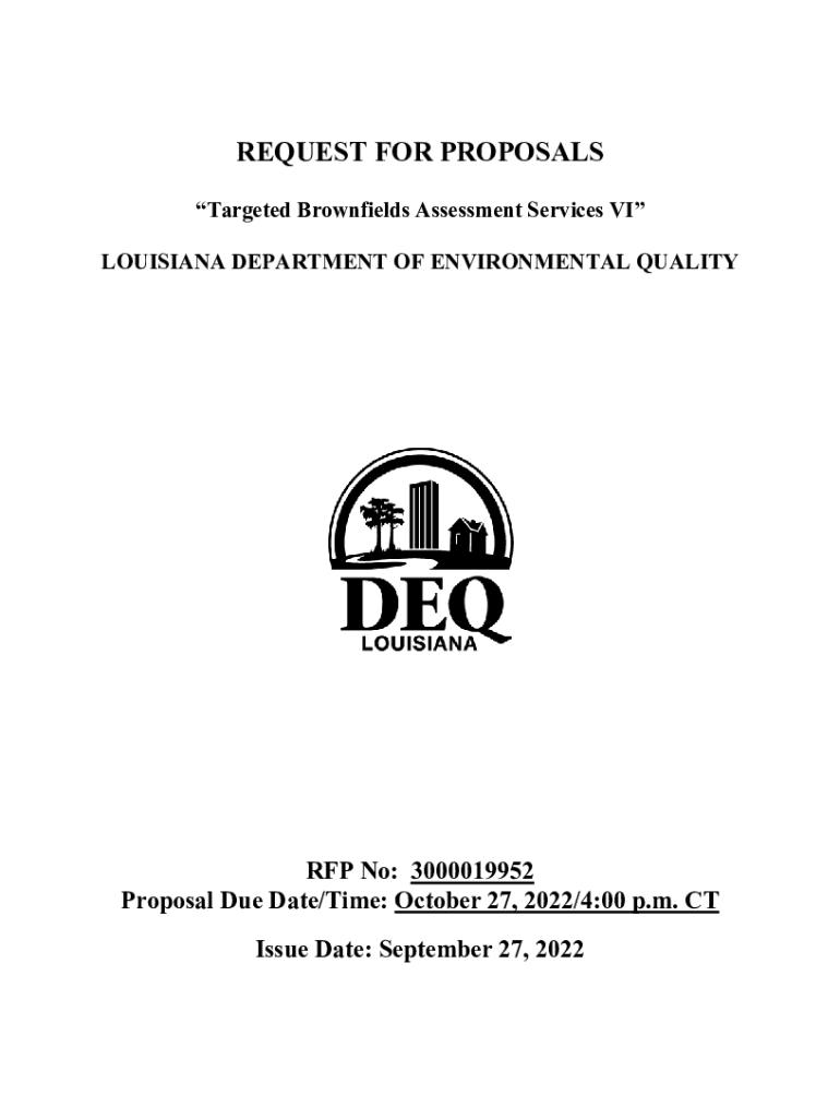 REQUEST FOR PROPOSALS Targeted Brownfield Assessment Services VI LOUISIANA DEPARTMENT OF ENVIRONMENTAL QUALITY RFP No: 3000019952 Proposal Due Date/Time: October 27, 2022/4:00 p.m. CT Issue Date: