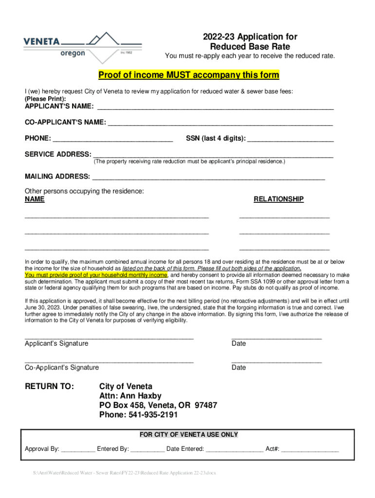 202223 Application for Reduced Base Rate You must reapply each year to receive the reduced rate. Proof of income MUST accompany this form I (we) hereby request City of Veneto to review my application