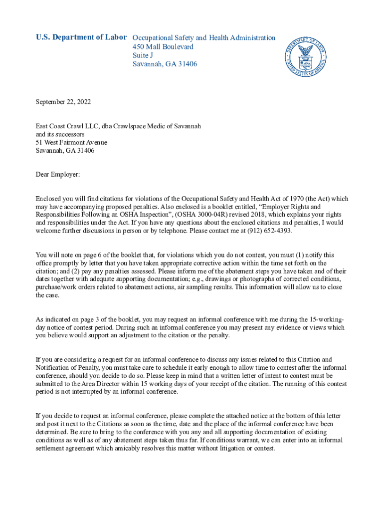 U.S. Department of Labor Occupational Safety and Health Administration 450 Mall Boulevard Suite J Savannah, GA 31406September 22, 2022 East Coast Crawl LLC, DBA Crawlspace Medic of Savannah and its
