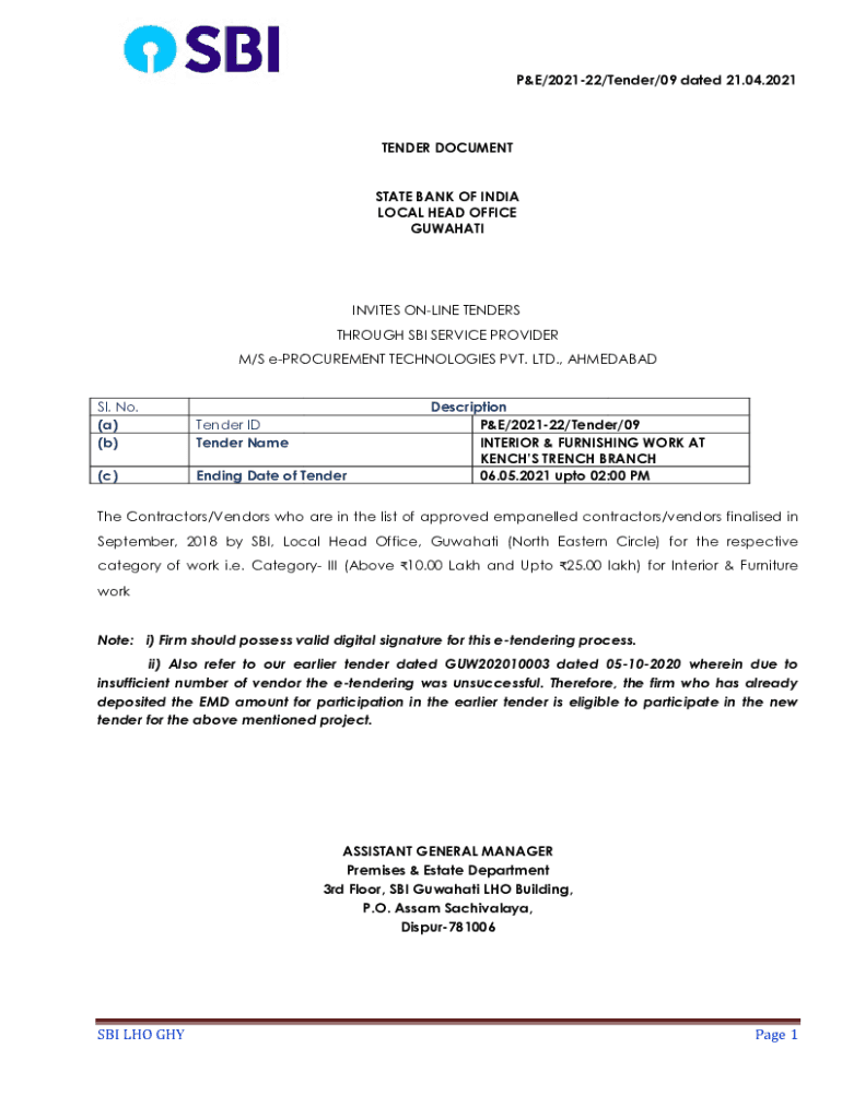P&E/202122/Tender/09 22/Tender/09 dated 21.04.2021TENDER DOCUMENT STATE BANK OF INDIA LOCAL HEAD OFFICE GUWAHATIINVITES ONLINE TENDERS THROUGH SBI SERVICE PROVIDER M/Se PROCUREMENT TECHNOLOGIES PVT.