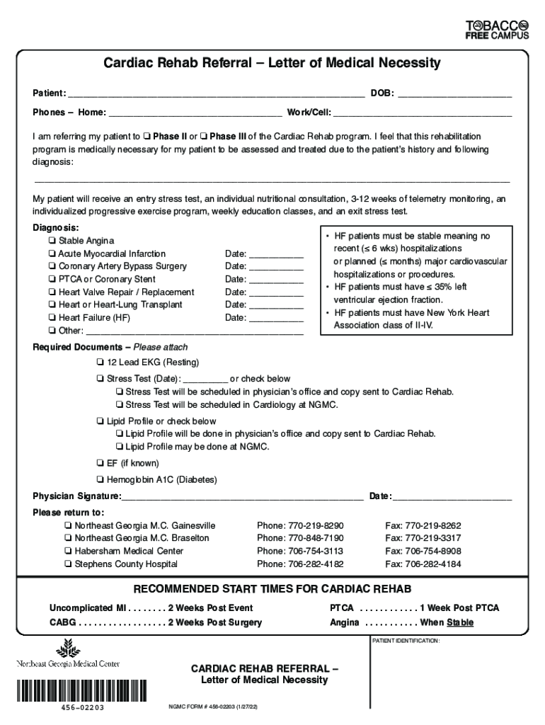 Cardiac Rehab Referral Letter of Medical Necessity Patient: ___ DOB: ___ Phones Home: ___ Work/Cell: ___ I am referring my patient to o Phase II or o Phase III of the Cardiac Rehab program. I feel