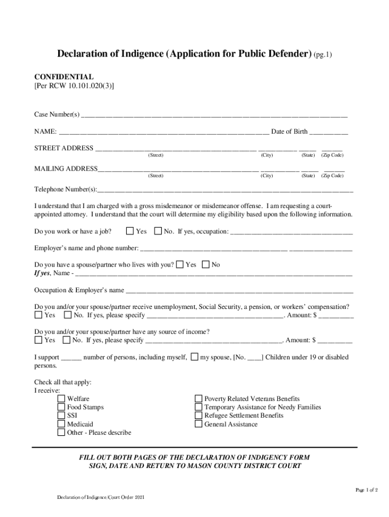 Declaration of Indigence (Application for Public Defender) (pg.1) CONFIDENTIAL [Per RCW 10.101.020(3)] RESET Case Number(s) ___ NAME: ___ Date of Birth ___ STREET ADDRESS ___ ___ ___ ___ (Street)(City)(State)(Zip