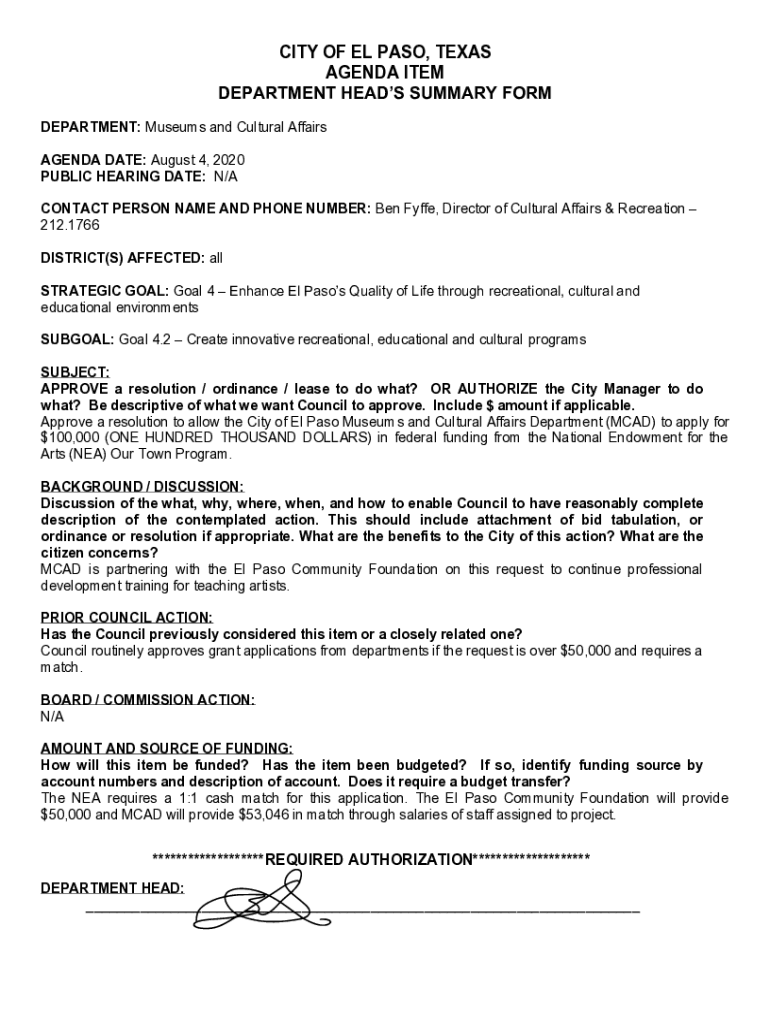 CITY OF EL PASO, TEXAS AGENDA ITEM DEPARTMENT HEADS SUMMARY FORM DEPARTMENT: Museums and Cultural Affairs AGENDA DATE: August 4, 2020, PUBLIC HEARING DATE: N/A CONTACT PERSON NAME AND PHONE NUMBER: