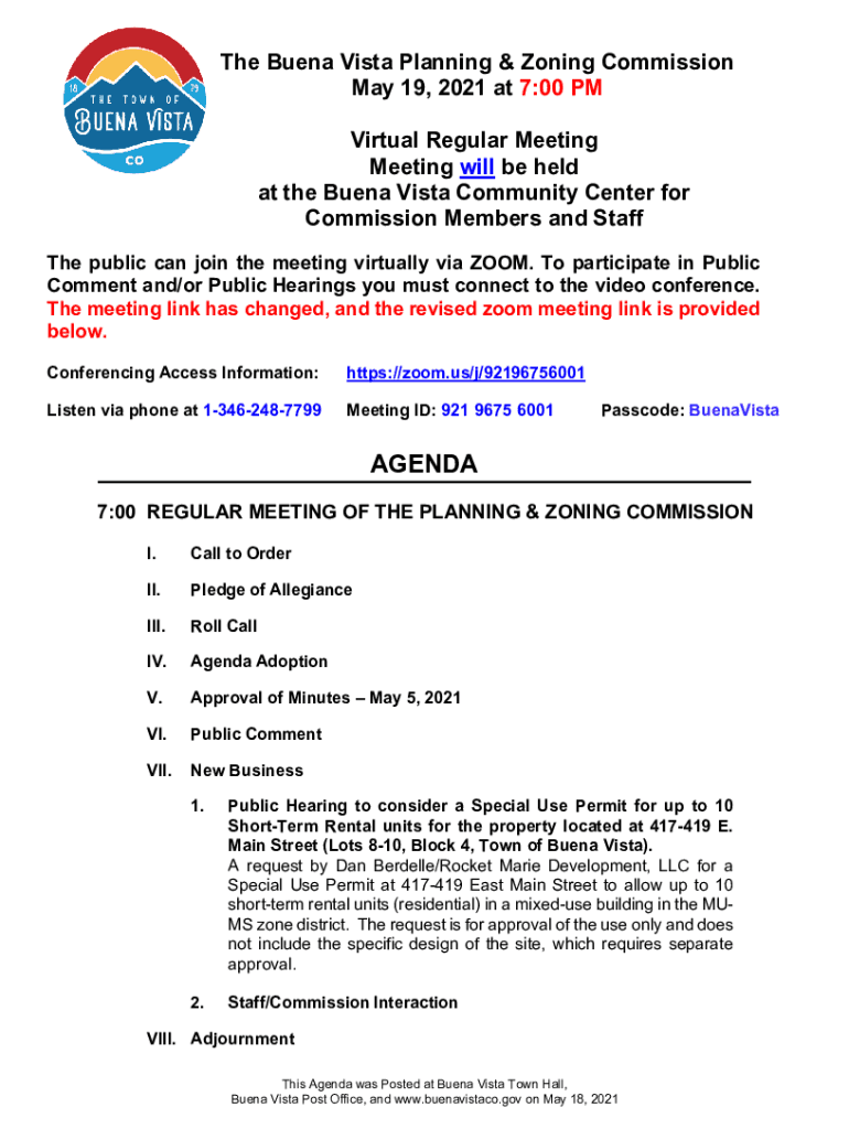 The Buena Vista Planning & Zoning Commission May 19, 2021, at 7:00 PM Virtual Regular Meeting will be held at the Buena Vista Community Center for Commission Members and Staff The public can join