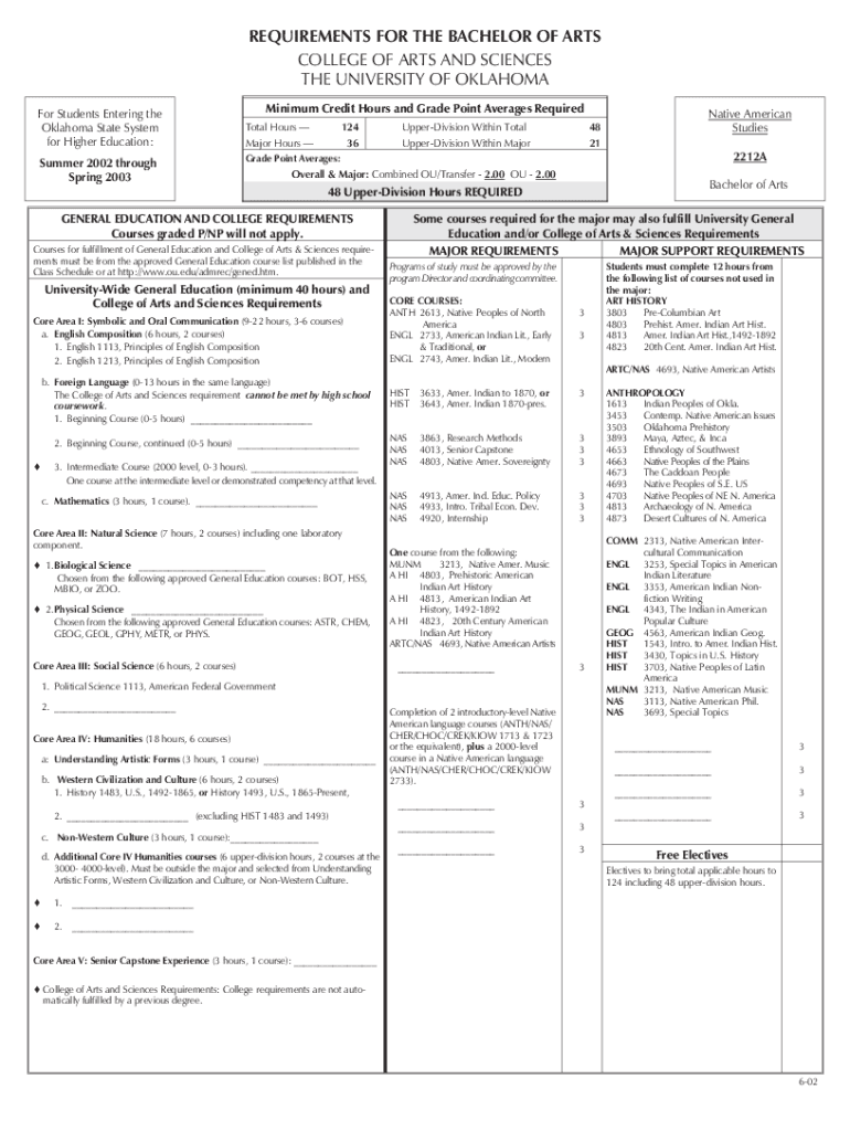REQUIREMENTS FOR THE BACHELOR OF ARTS COLLEGE OF ARTS AND SCIENCES THE UNIVERSITY OF OKLAHOMA For Students Entering the Oklahoma State System for Higher Education: Summer 2002 through Spring 2003Minimum