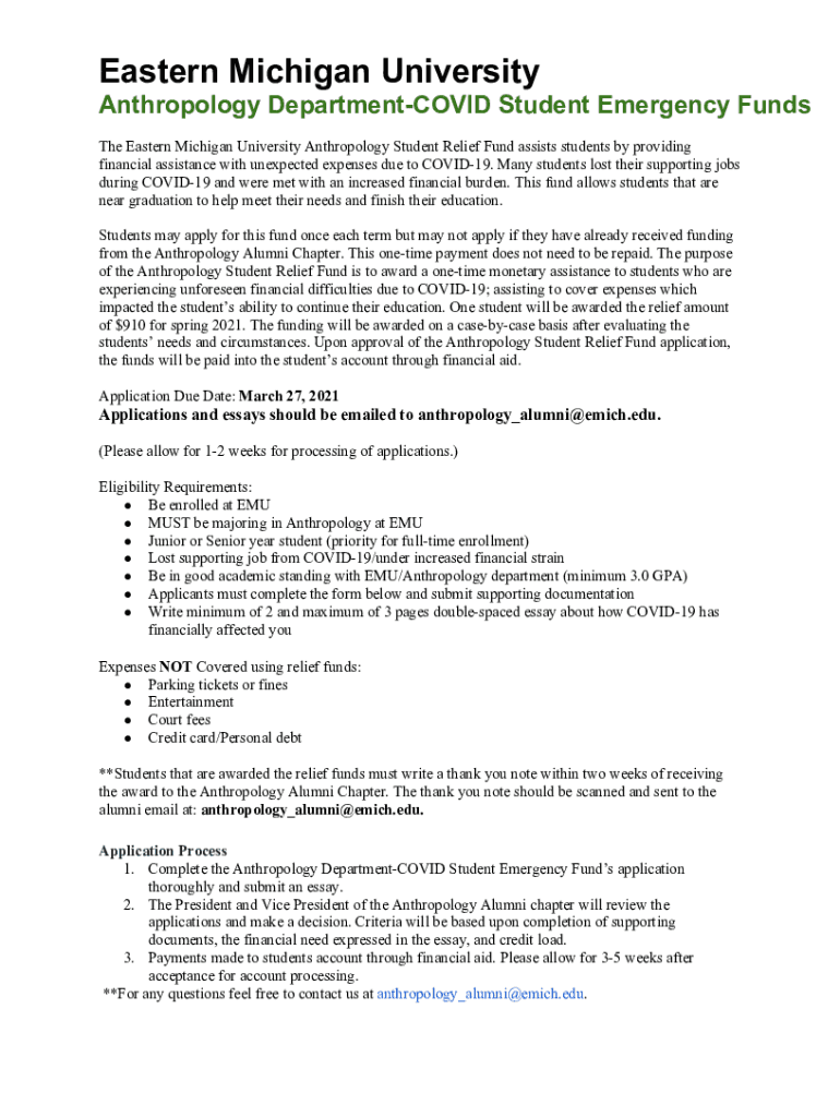 Eastern Michigan University Anthropology Department COVID-19 Student Emergency Funds The Eastern Michigan University Anthropology Student Relief Fund assists students by providing financial assistance