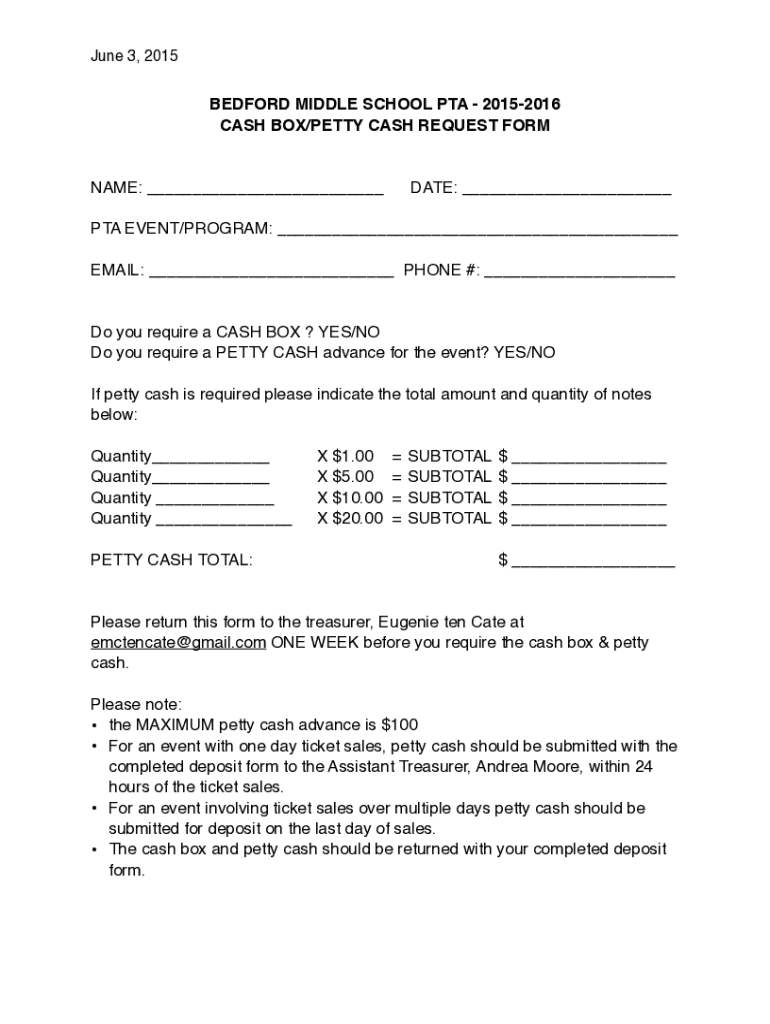June 3, 2015BEDFORD MIDDLE SCHOOL PTA 20152016 CASH BOX/PETTY CASH REQUEST FORENAME: ___DATE: ___PTA EVENT/PROGRAM: ___ EMAIL: ___ PHONE #: ___Do you require a CASH BOX ? YES/NO Do you require a PETTY