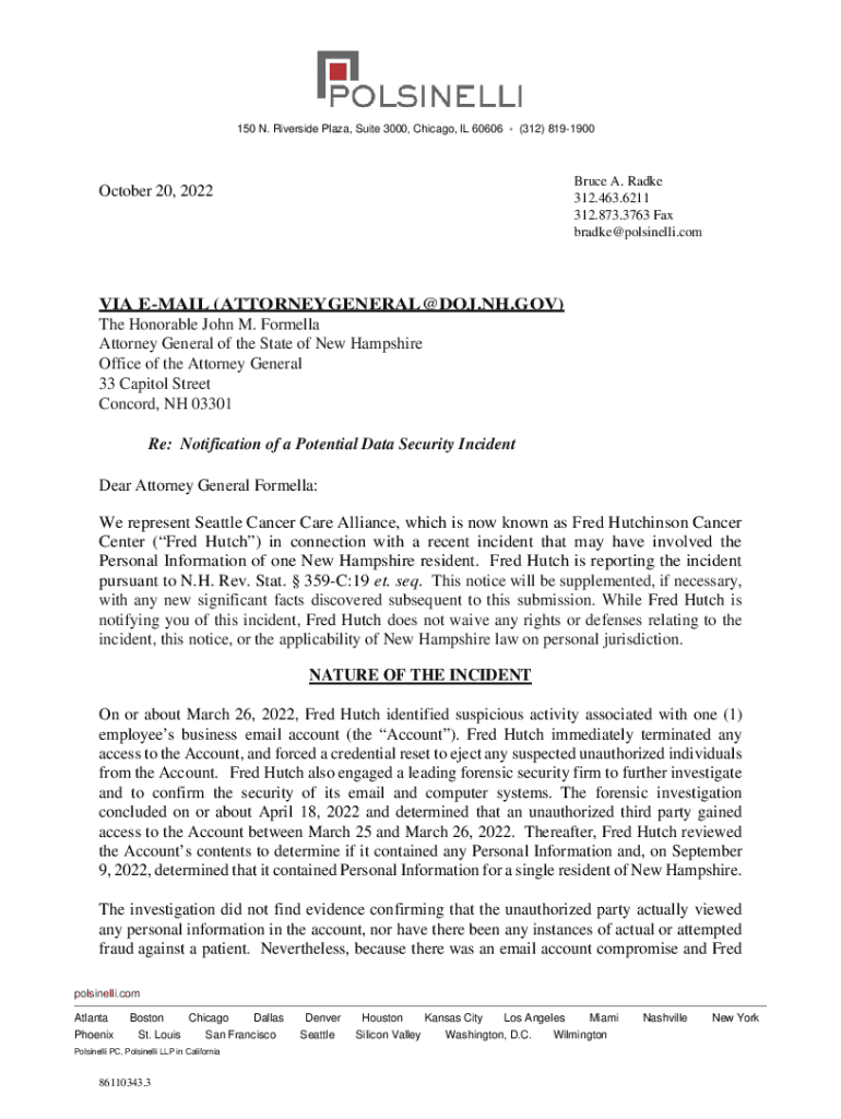 150 N. Riverside Plaza, Suite 3000, Chicago, IL 60606(312) 8191900Bruce A. Rake 312.463.6211 312.873.3763 Fax bradke@polsinelli.comOctober 20, 2022VIA EMAIL (ATTORNEYGENERAL@DOJ.NH.GOV) The Honorable