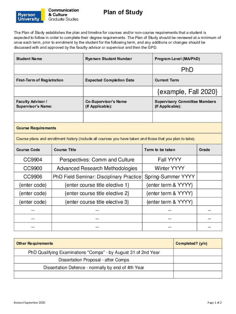 Plan of Study The Plan of Study establishes the plan and timeline for courses and/or concourse requirements that a student is expected to follow in order to complete their degree requirements. The