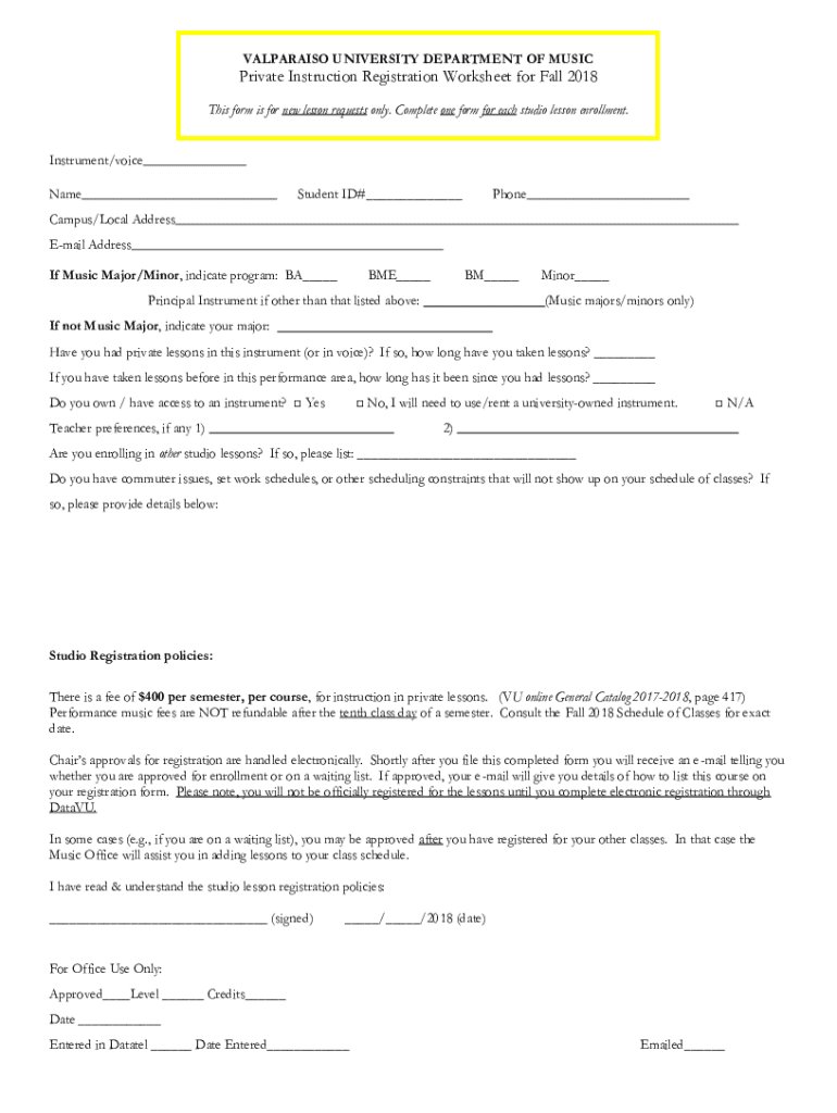 VALPARAISO UNIVERSITY DEPARTMENT OF MUSIC Private Instruction Registration Worksheet for Fall 2018 This form is for new lesson requests only. Complete one form for each studio lesson enrollment. Instrument/voice
