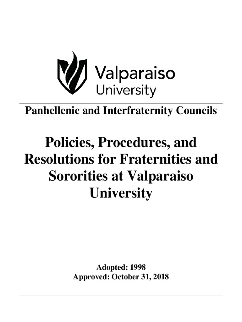 Panhellenic and Interfraternity CouncilsPolicies, Procedures, and Resolutions for Fraternities and Sororities at Valparaiso UniversityAdopted: 1998 Approved: October 31, 2018Fraternity and Sorority