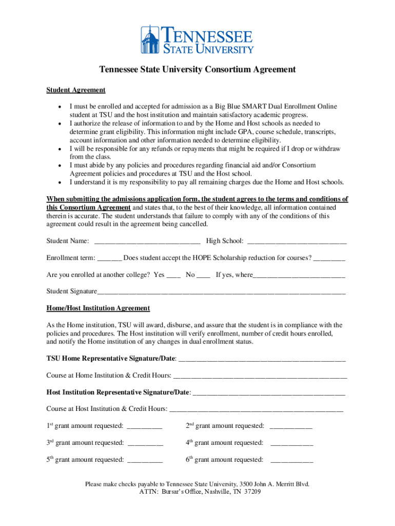 Tennessee State University Consortium Agreement Student Agreement I must be enrolled and accepted for admission as a Big Blue SMART Dual Enrollment Online student at CSU and the host institution and