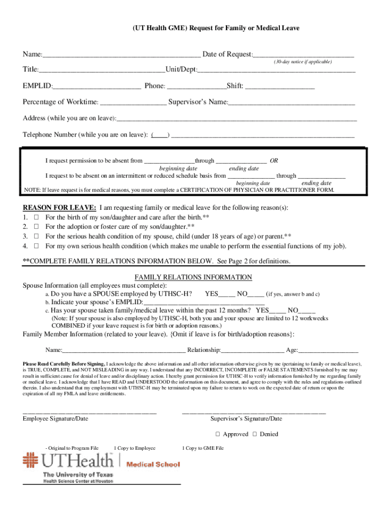 Get the free (UT Health GME) Request for Family or Medical Leave