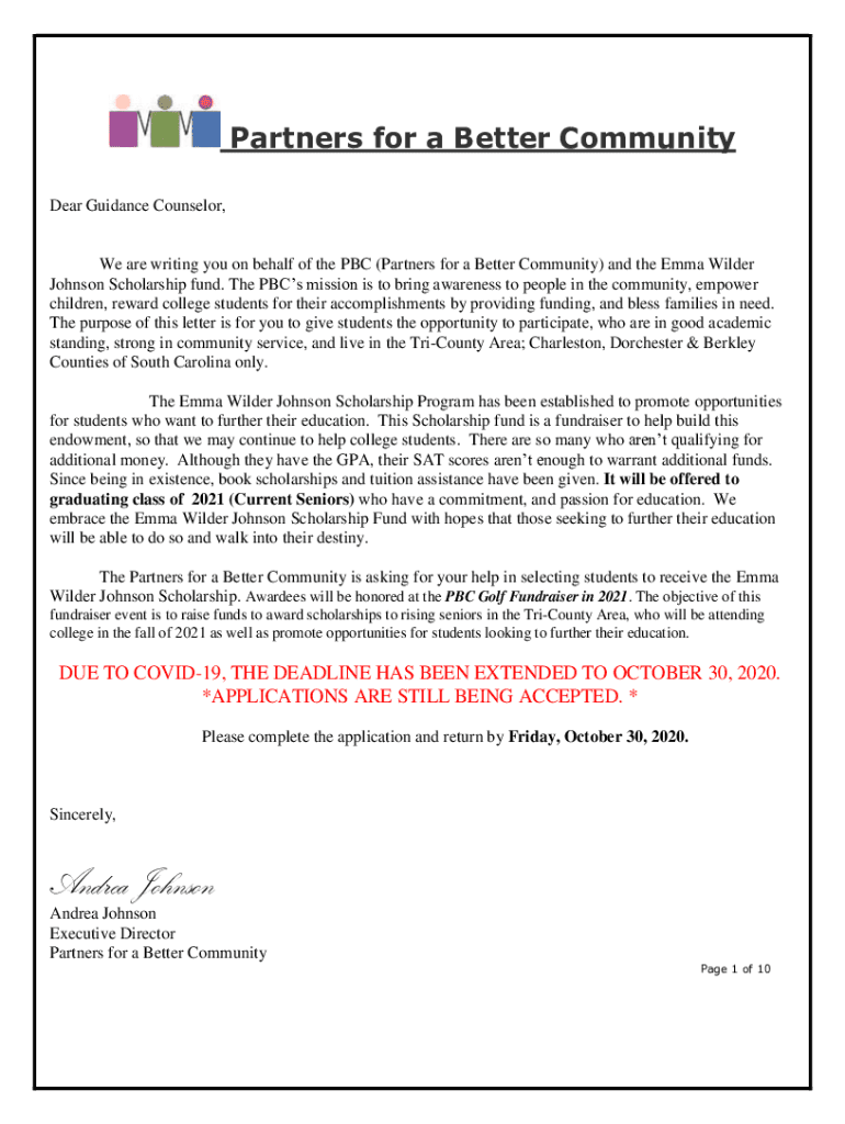 Partners for a Better Community Dear Guidance Counselor, We are writing you on behalf of the PBC (Partners for a Better Community) and the Emma Wilder Johnson Scholarship fund. The PCs mission is