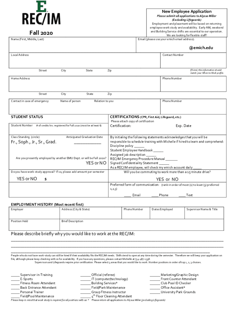 New Employee Application Please submit all applications to Alyssa Miller (Excluding Lifeguards) Employment and placement will be based on returning employee work study and availability. Early AM,