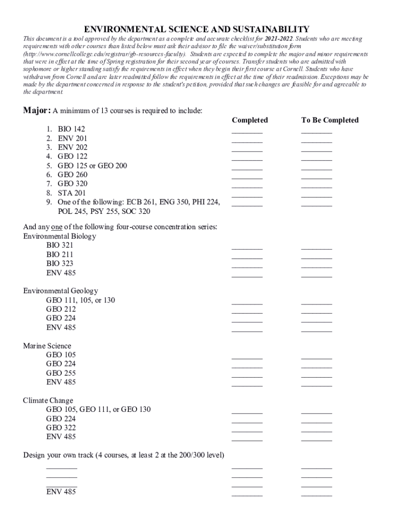ENVIRONMENTAL SCIENCE AND SUSTAINABILITYThis document is a tool approved by the department as a complete and accurate checklist for 20212022. Students who are meeting requirements with other courses
