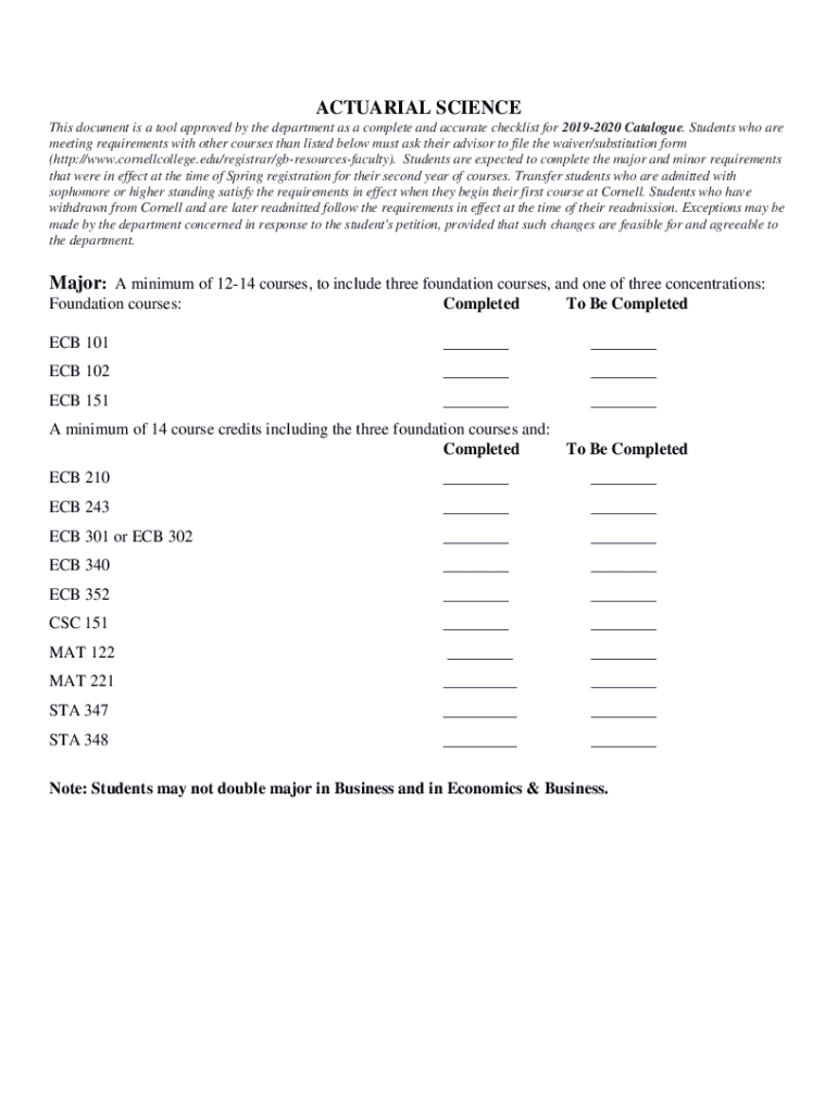 ACTUARIAL SCIENCE This document is a tool approved by the department as a complete and accurate checklist for 20192020 Catalogs. Students who are meeting requirements with other courses than listed