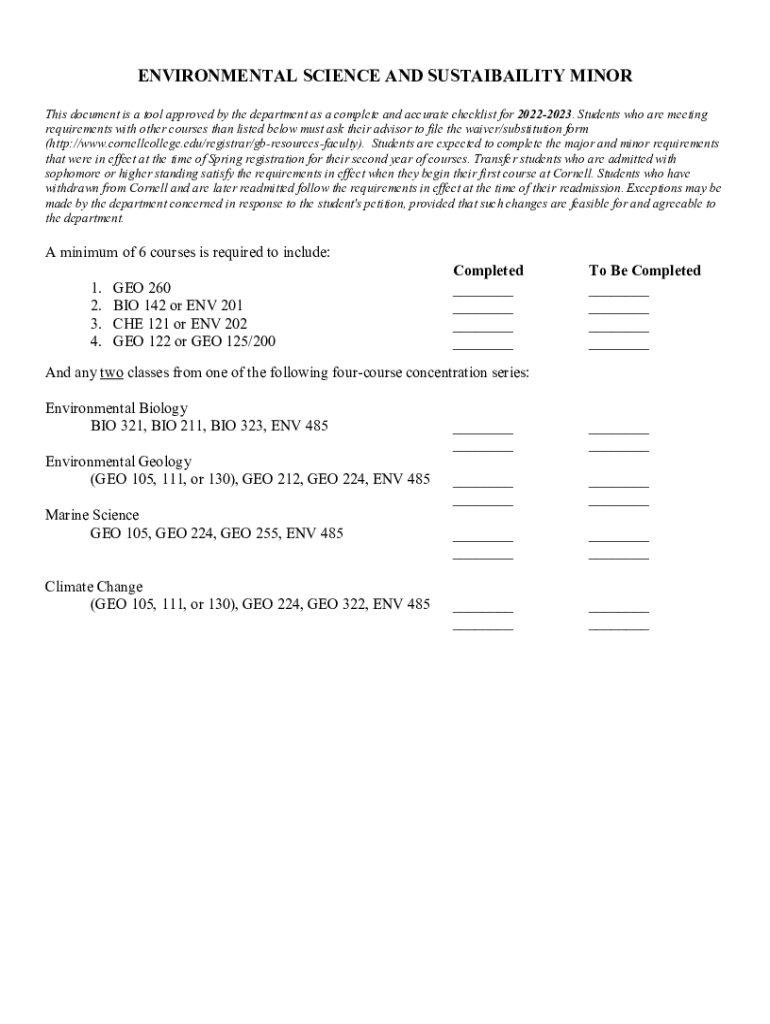 ENVIRONMENTAL SCIENCE AND SUSTAINABILITY MINOR This document is a tool approved by the department as a complete and accurate checklist for 20222023. Students who are meeting requirements with other