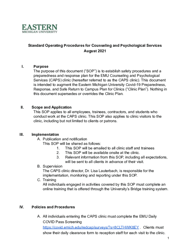 Standard Operating Procedures for Counseling and Psychological Services August 2021I. Purpose The purpose of this document (SOP) is to establish safety procedures and a preparedness and response plan