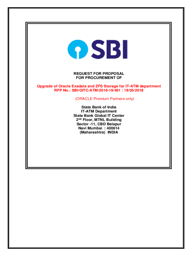 REQUEST FOR PROPOSAL FOR PROCUREMENT OF Upgrade of Oracle Metadata and ZFS Storage for IT ATM department RFP No.: SBI/GITC/ATM/201819/481 : 18/05/2018 (ORACLE Premium Partners only) State Bank of